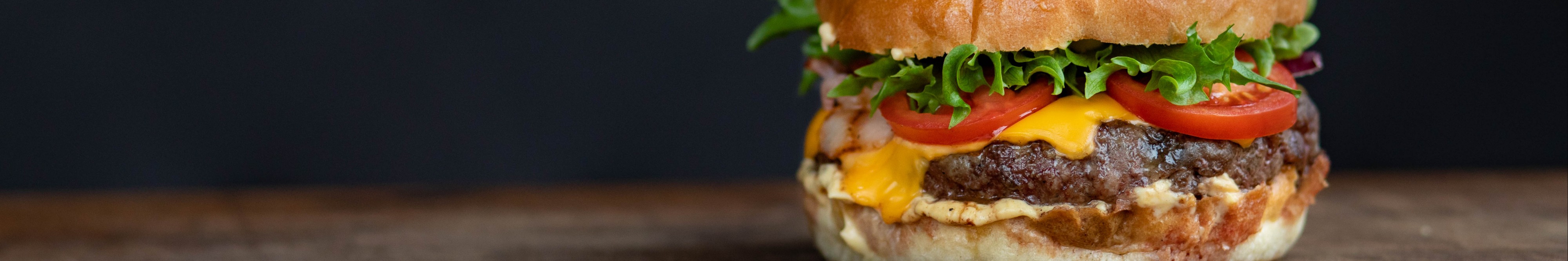 Бургер з яловичо-свинною котлетою, сиром, маринованим огірком та фірмовим соусом 938 ккал Б: 32 г · Ж: 61 г · В: 63 г